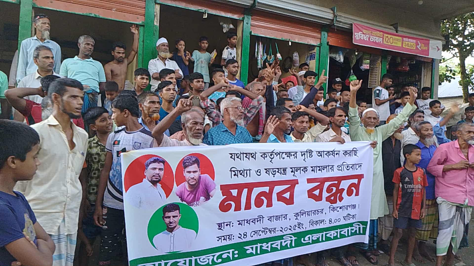 মিথ্যা ধারা সংযোজন করায় কুলিয়ারচরে এলাকাবাসীর মানববন্ধণ।